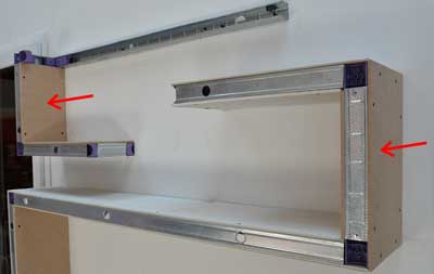 Pour la niche hi-fi centrale, on créé l'étagère en insérant 2 grandes cales dans un morceau de montant métallique. On visse l'ensemble dans la structure déjà créée.