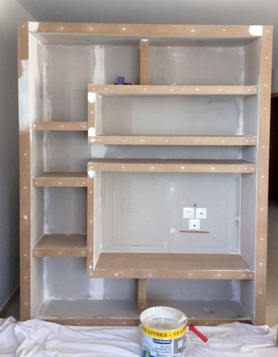 La structure métallique est assemblée avec des cales Kinook et des montants puis recouverte de plaques en medium (étagères) ou en plâtre.